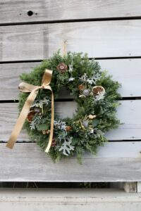 クリスマスにお部屋や玄関扉に飾るリースを作ります。材料は生の杉やコニファーを使用します。