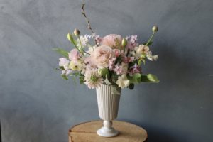 優しい色合いの春の花たちと一緒にアレンジに仕上げます。