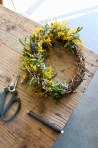 ミモザやドライになる素材を利用してリースをお作りいただきます。